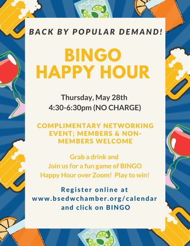 Join us for a complimentary networking event! Grab a drink and join us for a fun game of BINGO Happy Hour, ZOOM style! Have to play for your chance to win. Register for a Bingo card which will be emailed to you the day before with the meeting link.